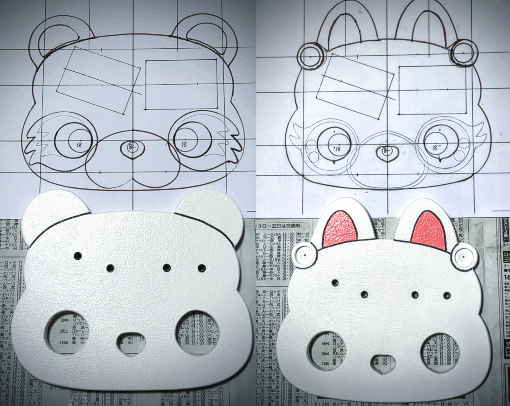 以前のモデルには、ハッキリとした目玉と鼻パーツが付いてました。それを今のモデルに組み込めないかなぁ?と。。。