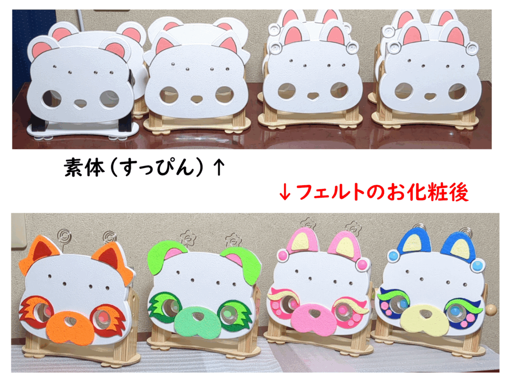 今の値段でその負担は避けたいということで、ハサミで切れるような柔らかめのプラスチック(スチロール?)を土台にして、表面にフェルトを貼ってみました。以前のような立体感はありませんが、ちょっとモフモフしてて、これはこれでイケそうです。