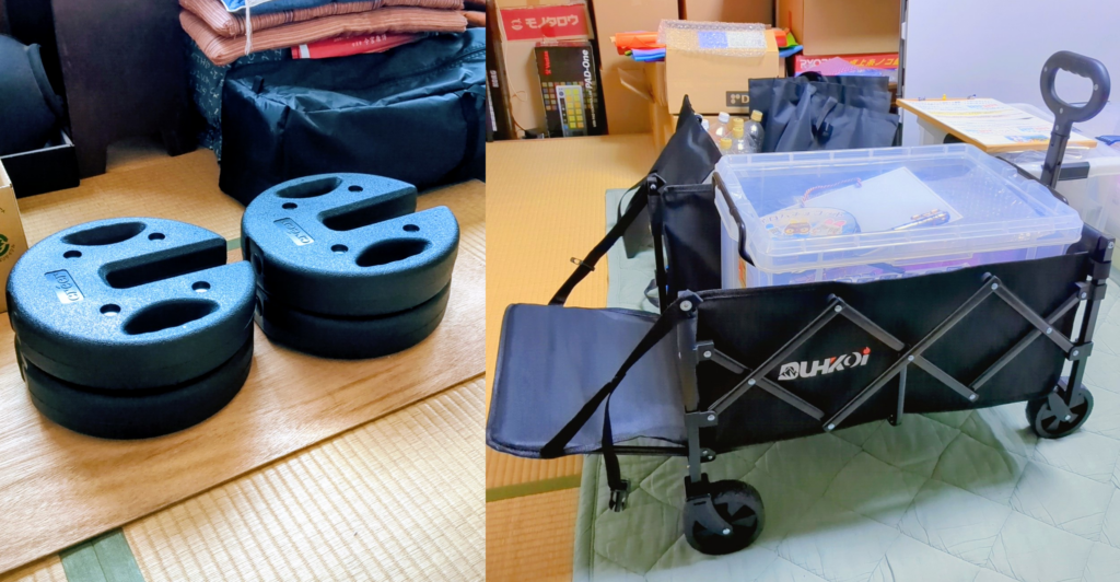 写真左のテントの重りは 6kg×4=24kg です。これが家に届いた時に「重っ!」ってなって、やっぱりカートも買っとこかぁと思いました。どうせ彦根のマルシェでも必要やし。